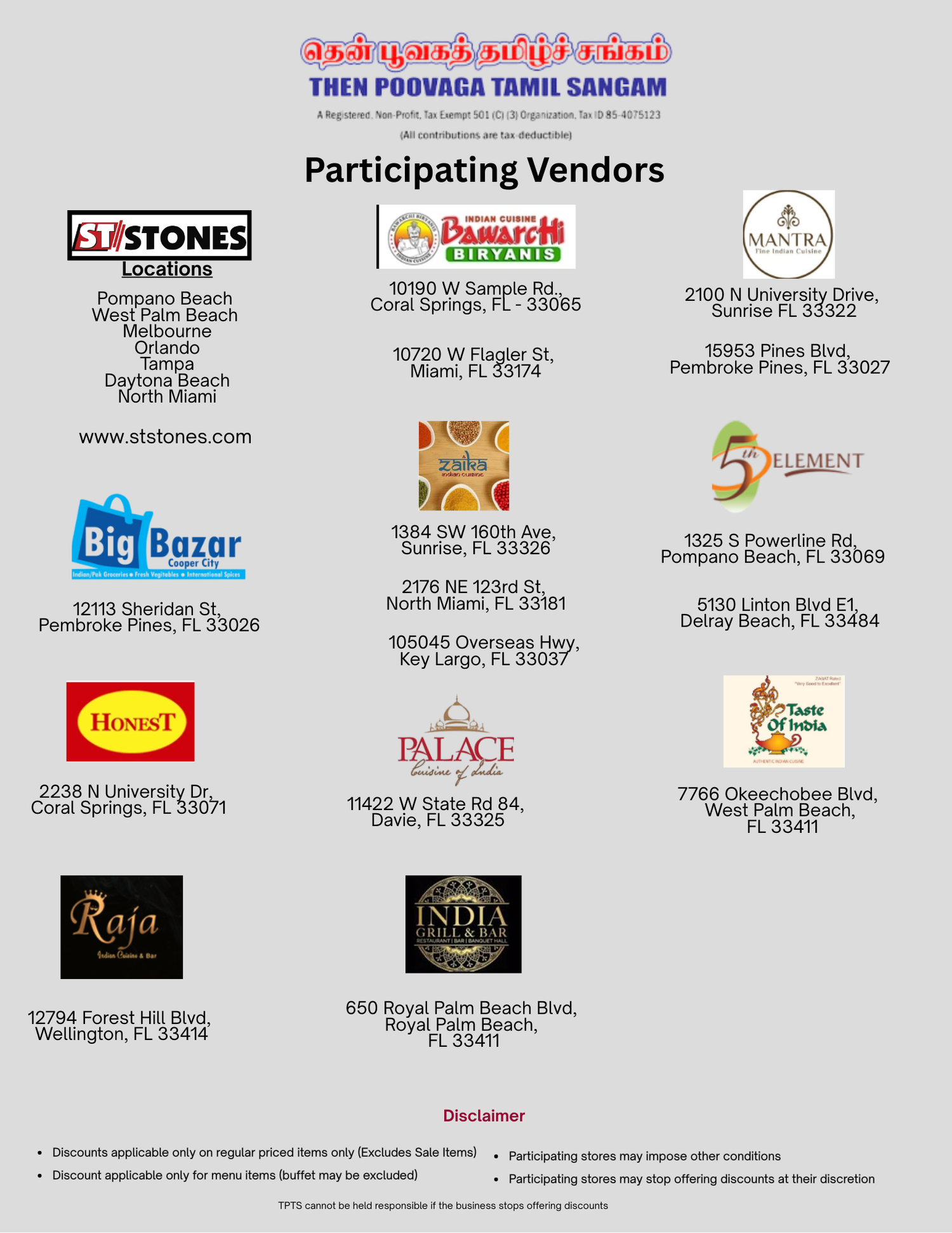Then Poovaga Tamil Sangam is a registered 501(c)(3) non-profit organization. Membership fees and contributions support cultural, educational, and charitable activities of the Sangam.
